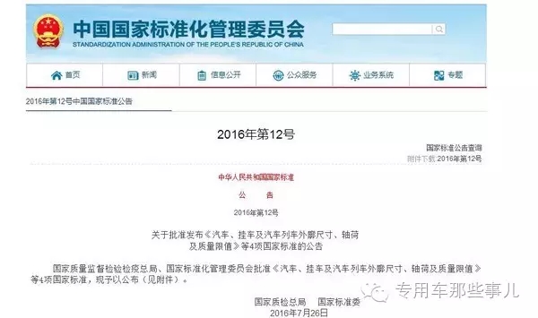 近日中國國家標(biāo)準(zhǔn)化管理委員會發(fā)布了2016年第12號中國國家標(biāo)準(zhǔn)公告, 國家質(zhì)量監(jiān)督檢驗(yàn)檢疫總局、國家標(biāo)準(zhǔn)化管理委員會批準(zhǔn)《汽車、掛車及汽車列車外廓尺寸、軸荷及質(zhì)量限值》、《車輛運(yùn)輸車通用技術(shù)條件》、《道路車輛 牽引桿連接器的互換性》、《 道路車輛 牽引車與掛車之間的電氣和氣動連接位置》四項(xiàng)國家標(biāo)準(zhǔn)。