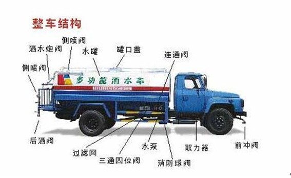 我國大部分地區(qū)灑水車主要配置;前沖(噴)后灑,帶側(cè)噴,罐體后帶工作平臺,平臺上安裝綠化灑水炮,灑水炮可全方位旋轉(zhuǎn),可連續(xù)調(diào)成直沖狀、大雨、小雨、毛毛雨,帶安全護(hù)欄,配備大功率專用灑水泵,泵可自吸自排,安裝過濾網(wǎng),帶消防接口,可通過消防栓進(jìn)水,帶自流閥。
